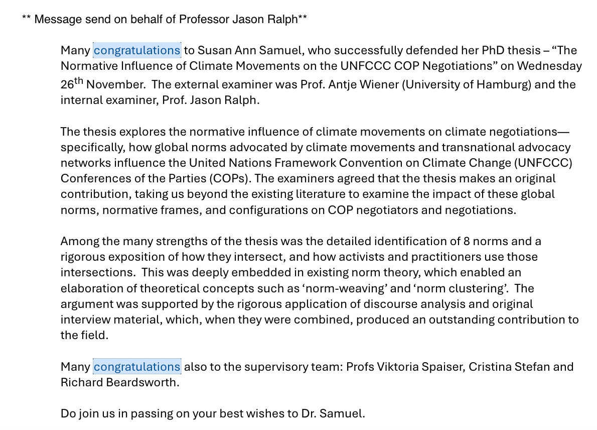 My thesis needed expert interviews from UNFCCC COP negotiators, diplomats, UN officials and more. Sourcing elite interviews was a touch challenge. But what helped most was the professional networks and random snowballing technique(s). I was supported by the Priestley Centre for Climate Futures to attend the COP28 in UAE in November-December 2023, the UN Climate Conference in Bonn (SB60) in June 2024, and COP29 in Baku, Azerbaijan. I, therefore, attended these conferences as University of Leeds delegate and the University's UNFCCC Task Force Youth Rep (see here).
